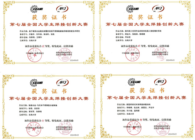在学校教务处、糖心视频 的大力支持下,本届大赛全国决赛的糖心视频 代表队由张泰瑞老师带队参加,并受邀担任固定命题组评委。经过紧张激烈的比赛,我校由张泰瑞、王青华两位老师指导,齐文鑫、朱培轩、刘华清、张凯4位同学的项目《基于硬质合金激光熔覆的双向不锈钢船舶轴系精准修复技术研究》获固定命题二等奖;由李永哲老师指导,郑业兴、张焕涛、陈晓璐3位同学的项目《面向狭小空间作业的软体机器人智能增材系统》获自由命题二等奖;由刘小超、温海营老师指导,李晓博、包文辉、薛雯岳、尹志宇4位同学的项目《新型桥梁式桁架焊接承载结构》;由裴宪军、张泰瑞老师指导,张硕、吴奕彤2位同学的项目《镍基合金-马氏体不锈钢复合板制备》获得固定命题三等奖。