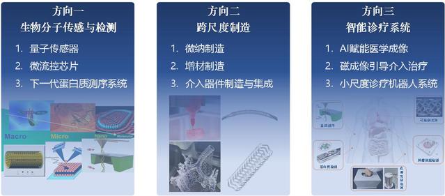 研究方向二是跨尺度制造,研究内容包括微纳制造、增材制造和医学装备的系统集成。研究方向三是智能诊疗系统,利用人工智能和机器人技术赋能诊疗,攻克医学设备中的核心技术,突破关键智能算法,实现人工智能技术和先进医学设备的有效融合,以提高疾病诊断和治疗的准确性、效率和安全性,保证人民生命健康的医疗质量。研究内容包括AI赋能医学成像、磁成像引导介入治疗和小尺度诊疗机器人系统。
