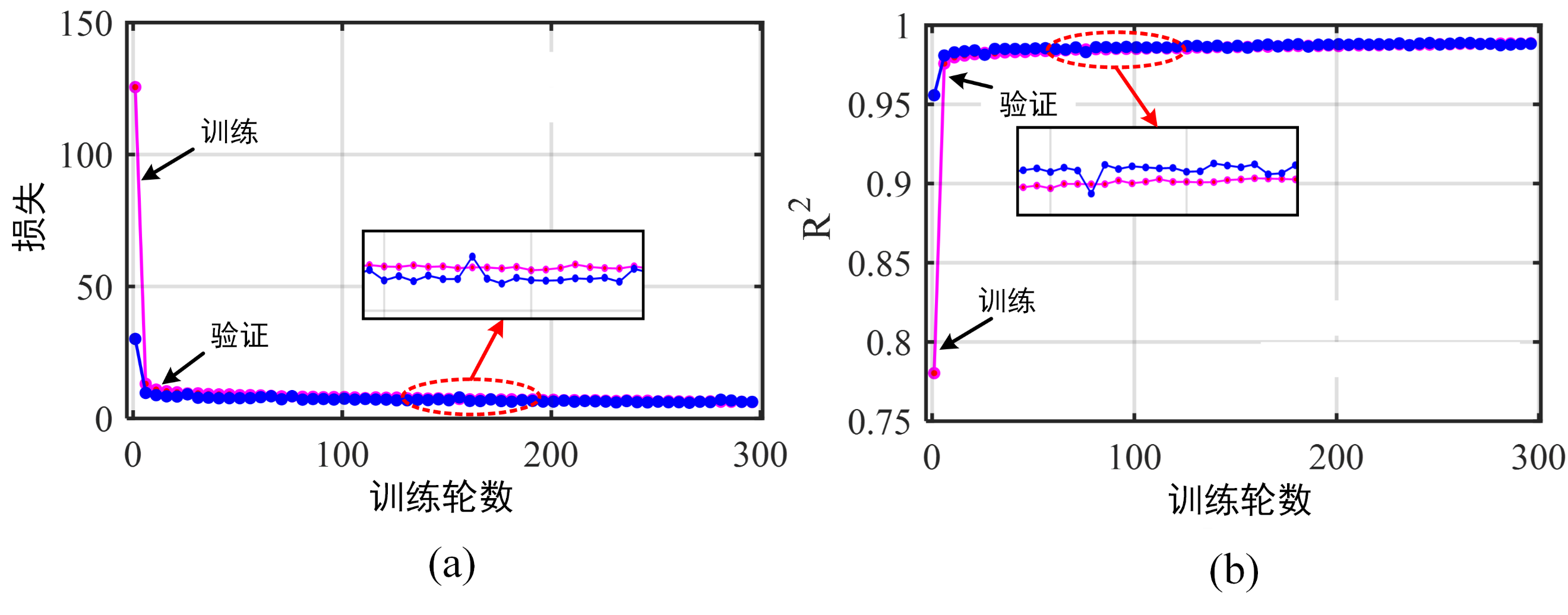 利用半解析有限元法(SAFE)构建频散曲线数据集训练ENet模型。训练数据集的规模和质量对于深度学习模型的实际应用是一个棘手的问题。但凭借半解析有限元法高效的计算效率,ENet的训练集极易获得。通过将频散曲线与弹性模量非线性关联,避免了模型学习过程中实验环境对数据集的干扰。ENet模型的训练和测试在Inter® Core™ i5-1135G7及Inter® Iris® Xe Graphics服务器平台进行。在训练ENet模型前,可以对数据集进行预处理,对每批次中的输入数据进行归一化。以学习率0.0001训练ENet 300轮(Epoch),训练过程耗费大约半小时。训练和验证的结果:损失和R2 coefficient曲线如图3所示。