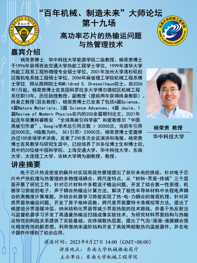 杨荣贵博士, 华中科技大学能源学院二级教授。杨荣贵博士于1996年获得西安交通大学热能工程学士学位,1999年清华大学热能工程系工程热物理专业硕士学位,2001年加州大学洛杉矶校区微机电系统工程硕士学位,2006年麻省理工学院机械工程系博士学位, 师从陈刚院士和Mildred S. Dresselhaus院士。自2006年1月起,杨荣贵博士在美国科罗拉多大学博尔德校区机械工程系任职13年,历任助理教授、副教授(提前两年获得终身教职)、终身正教授(冠名教授)。杨荣贵博士已发表了包括4篇Science、4篇Nature Materials、3篇 Science Advances、4篇 Joule、1篇Review of Modern Physics在内的200余篇期刊论文。2021年起连年荣膺科睿唯安 “全球高被引科学家”和爱斯维尔“中国高被引作者”,Google学术总引用次数 > 30000次,当前年引用近5000次,H指数为85, SCI引用> 23000次。杨荣贵博士受邀举办过100余场学术讲座,发表了200多次会议演讲和海报。杨荣贵博士在其教学与研究生涯中,已经培养了30多位博士生和博士后,其中约20位被中国科学院、上海交通大学、华中科技大学、糖心视频 、大连理工大学、吉林大学聘为副教授、教授。
