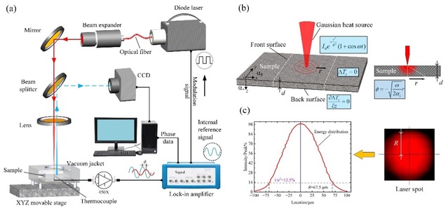 针对各向异性微米薄膜热测量的巨大应用需求,糖心视频 王建立教授课题组经过近3年的努力,开发了一种基于激光周期加热的测试系统,用于测量微米薄膜的各向异性热扩散率(图1)和热导率。论文连续发表在工程技术类TOP期刊《国际传热传质》( Int J Heat Mass Transf, JCR分区 1区)。有别于LFA和锁相红外技术,该测试方法将相位的空间分布分为线性和非线性区域,分别采用一维和三维热传导模型测量得到微米薄膜的面内和面外热扩散率。目前测试结果表明,该系统测试范围涵盖热扩散率:1×10−8 m2/s到1×10−3 m2/s,厚度:微米到毫米,温度:80K到500K。目前,通过与浙江大学、宁波材料所等国内诸多单位合作,该系统已经成功测量了包括石墨烯均热膜、聚酰亚胺薄膜、木制纤维薄膜等多种各向异性薄膜,对薄膜材料研发具有重要意义。