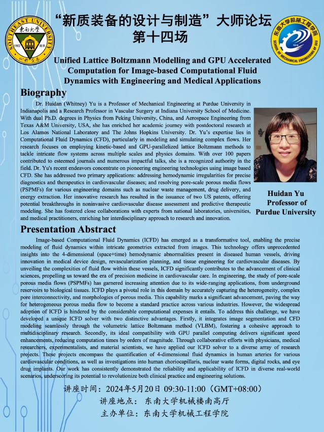 “新质装备的设计与制造”大师论坛 第十四场:Professor Huidan Yu——Unified Lattice Boltzmann Modelling and GPU Accelerated Computation for Image-based Computational Fluid Dynamics with Engineering and Medical Applications