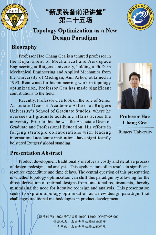 Professor Hae Chang Gea is a tenured professor in the Depar tm ent of M echanical and Aer os pace Engineering at Rutgers University, holding a Ph.D. in Mechanical Engineering and Applied Mechanics from the University of Michigan, Ann Arbor, obtained in 1993. Renowned for his pioneering work in topology optimization, Professor Gea has made significant contributions to the field. Recently, Professor Gea took on the role of Senior Associate Dean of Academic Affairs at Rutgers University’s School of Graduate Studies, where he oversees all graduate academic affairs across the university. Prior to this, he was the Associate Dean of Graduate and Professional Education. His efforts in forging strategic collaborations with leading international academic institutions have significantly bolstered Rutgers' global standing.