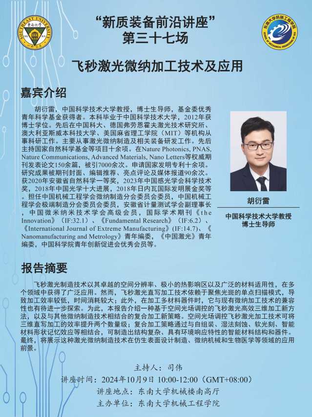 胡衍雷,中国科学技术大学教授,博士生导师,基金委优秀青年科学基金获得者。本科毕业于中国科学技术大学,2012年获博士学位。先后在中国科大、德国弗劳恩霍夫激光技术研究所、澳大利亚斯威本科技大学、美国麻省理工学院(MIT)等机构从事科研工作。主要从事激光微纳制造及相关装备研发工作。先后主持国家自然科学基金等项目十余项。在Nature Photonics, PNAS,Nature Communications, Advanced Materials, Nano Letters等权威期刊发表论文150余篇,被引7000余次。申请国家发明专利十余项。研究成果被期刊封面、编辑推荐、亮点评论及媒体报道90余次。获2020年安徽省自然科学一等奖,2023年中国感光学会科学技术奖,2018年中国光学十大进展,2018年日内瓦国际发明展金奖等。担任中国机械工程学会微纳制造分会委员会委员,中国机械工程学会极端制造分会委员会委员,安徽省计量测试学会副理事长, 中国微米纳米技术学会高级会员, 国际学术期刊《the Innovation》(IF:32.1)、《Fundamental Research》(IF:6.2)、《International Journal of Extreme Manufacturing》(IF:14.7)、《Nanomanufacturing and Metrology》青年编委,《中国激光》青年编委,中国科学院青年创新促进会优秀会员等。