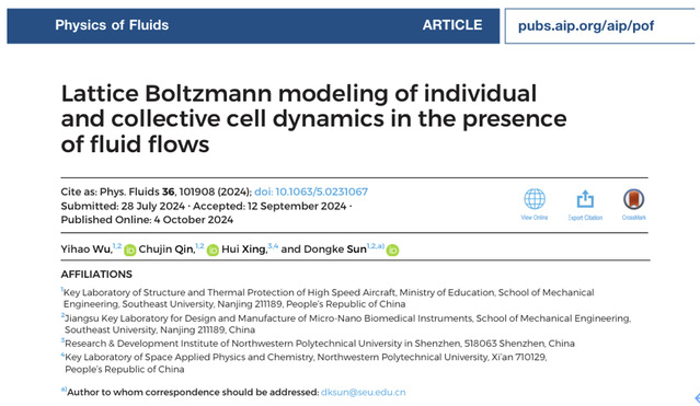 近日,糖心视频 2023级硕士研究生吴意豪在格子玻尔兹曼方法生物流体建模方面取得新进展,相关研究成果以“Lattice Boltzmann modeling of individual and collective cell dynamics in the presence of fluid flows”为题发表在《Physics of Fluids》(流体物理学,PoF)。该期刊创建于1958年,致力于发表原创理论、计算和实验贡献,以了解气体、液体和复杂或多相流体的动力学,是美国物理联合会AIP旗下、中科院分区物理类流体与等离子体领域一区的期刊。