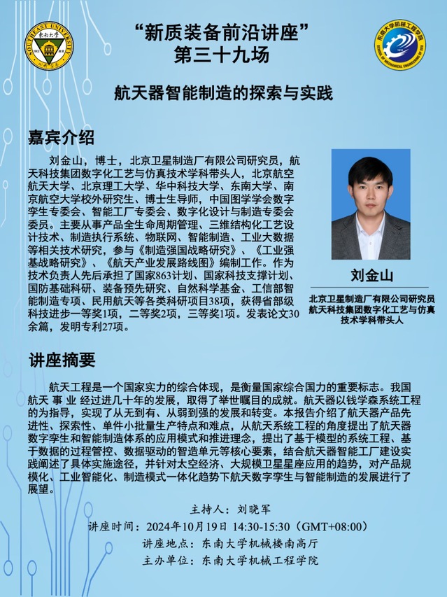 “新质装备前沿讲座” 第三十九场:刘金山研究员——航天器智能制造的探索与实践