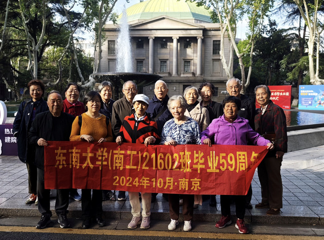 20日,校友们在四牌楼校区大礼堂前合影,参观了吴健雄纪念馆和六朝松、梅庵等地标,在五四楼——当年的教学楼里看夕阳西下。晚餐就在沙塘园食堂边用餐边怀旧。