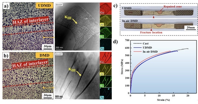 实际的实验结果表明,UDMD 过程中的快速冷却速率会产生独特的微观结构。与DMD修复样品相比,层间热影响区宽度和纳米κⅡ相平均尺寸均减小,修复样品中均未观察到κⅣ析出物。一个有趣的发现是κⅢ相分散地沉淀在基质中。拉伸试样均断裂在基材区域而不是修复区。然而,沉积过程中基底上的热暴露导致热影响区的κⅡ相轻微生长。与铸造基材相比,经DMD和UDMD修复的样品的拉伸强度降低了约7%。该研究证明了大型铜合金构件水下原位修复的可行性,也可为合金制造过程中通过外部环境条件控制微观组织的演变提供新的工艺参考。