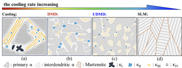 总体而言,镍铝青铜合金制造工艺从慢到快的冷却速率为:WAAM < DMD < UDMD < SLM。冷却速率显着影响 NAB 合金中的多重 κ 相变,具体转变结果如图4所示。与 SLM 相比,WAAM 的冷却速率更接近传统铸造技术,尤其是在单道次沉积大量材料时,领先降低后续层的冷却速率和更大的热影响区,从而产生与传统铸造工艺生产的材料相似的材料。