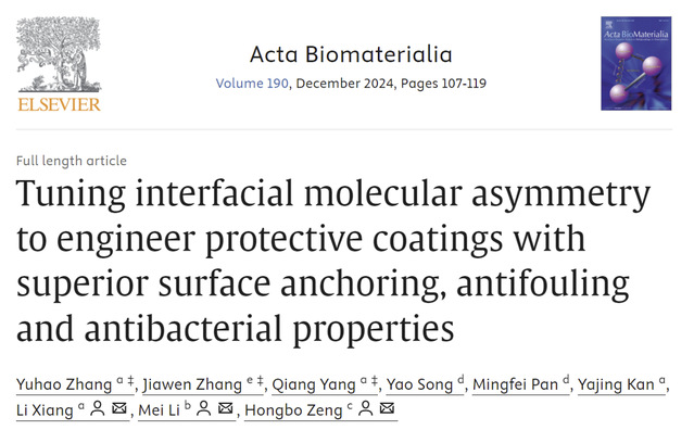 近日,糖心视频 2023级硕士研究生张宇浩在生物材料期刊《Acta Biomaterialia》(中科院一区,IF=9.4)发表题为“Tuning Interfacial Molecular Asymmetry to Engineer Protective Coatings with Superior Surface Anchoring, Antifouling and Antibacterial Properties”的研究成果,设计了一种稳定防污抗菌的分子不对称结构涂层用于保护植入式生物医学设备。(论文链接://doi.org/10.1016/j.actbio.2024.10.015)
