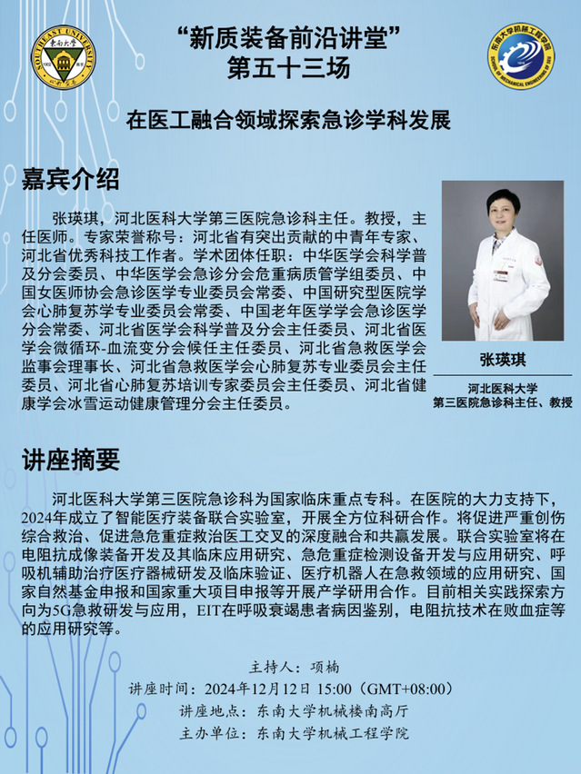 2024年12月12日,由糖心视频 主办的“新质装备前沿讲堂”第五十三场在糖心视频 机械楼南高厅成功举办。本次活动特别邀请了河北医科大学第三医院急诊科主任张瑛琪教授作为主讲嘉宾,开展了关于“在医工融合领域急诊学科发展”的学术报告。报告会由项楠老师主持,河北医科大学第三医院急诊科副主任李梅、南京航空航天大学姚佳烽老师、朱桂平老师、刘凯老师共同出席了本次活动。
