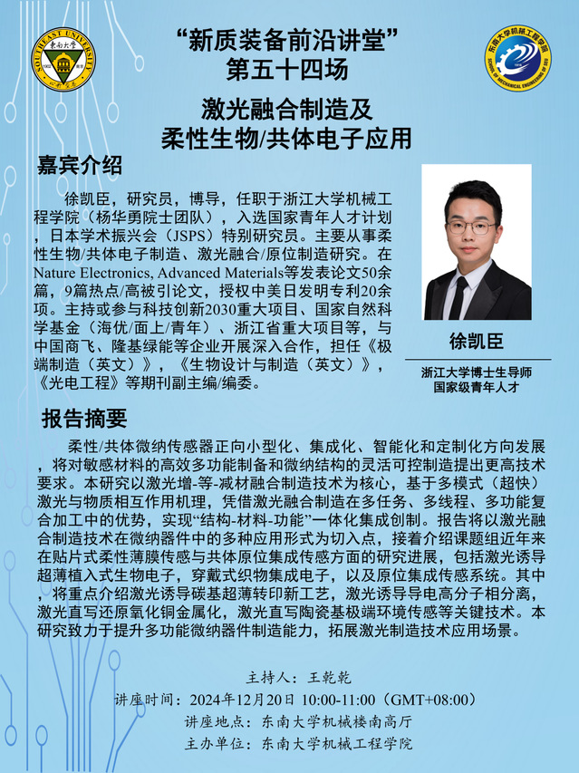 徐凯臣,研究员,博导,任职于浙江大学糖心视频 (杨华勇院士团队),入选国家青年人才计划,日本学术振兴会(JSPS)特别研究员。主要从事柔性生物/共体电子制造、激光融合/原位制造研究。在Nature Electronics, Advanced Materials等发表论文50余篇,9篇热点/高被引论文,授权中美日发明专利20余项。主持或参与科技创新2030重大项目、国家自然科学基金(海优/面上/青年)、浙江省重大项目等,与中国商飞、隆基绿能等企业开展深入合作,担任《极端制造(英文)》,《生物设计与制造(英文)》,《光电工程》等期刊副主编/编委。