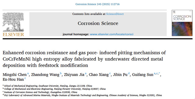 近日,糖心视频 机械制造系孙桂芳教授与广东腐蚀科学与技术创新研究院、华南理工大学韩恩厚院士合作,采用水下激光沉积技术一步成形制备氮间隙固溶CoCrFeMnNi高熵合金。系统研究氮间隙固溶CoCrFeMnNi高熵合金沉积层的微观组织、自钝化行为、极化特征和以及气孔诱导点蚀机制。相关研究成果以“Enhanced corrosion resistance and gas pore-induced pitting mechanisms of CoCrFeMnNi high entropy alloy fabricated by underwater directed metal deposition with feedstock modification”为题发表在腐蚀科学领域顶级期刊《Corrosion Science》。