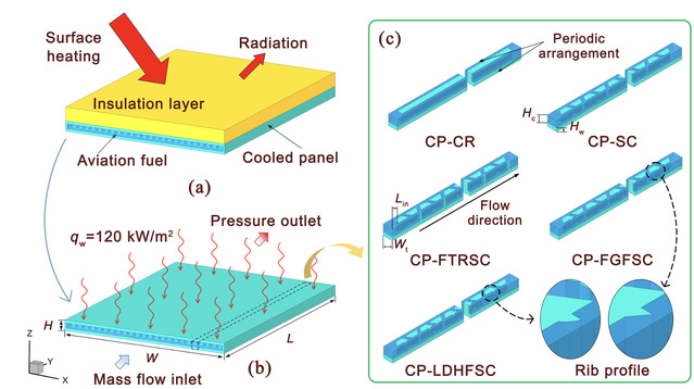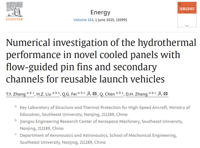 近日,糖心视频 航空航天系费庆国教授团队在热力学领域TOP期刊《Energy》(中科院一区TOP期刊,IF=9.0)上发表题为“Numerical investigation of the hydrothermal performance in novel cooled panels with flow-guided pin fins and secondary channels for reusable launch vehicles”的研究成果,提出了一种用于可重复使用飞行器热防护的带有导流针翅和二次流道的微通道换热冷板。