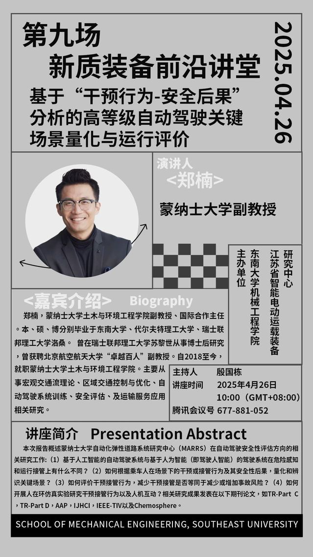 本次报告概述蒙纳士大学自动化弹性道路系统研究中心(MARRS)在自动驾驶安全性评估方向的相关研究工作:(1)基于人工智能的自动驾驶系统与基于人为智能(即驾驶人智能)的驾驶系统在危险感知和运行接管上有什么不同?(2)如何根据乘车人在场景下的干预或接管行为及其安全性后果,量化和辨识关键场景?(3)如何评价干预接管行为,减少干预接管是否等同于减少或增加事故风险?(4)如何开展人在环仿真实验研究干预接管行为以及人机互动?相关研究成果发表在以下期刊论文,如TR-Part C,TR-Part D,AAP,IJHCI,IEEE-TIV以及Chemosphere。 嘉宾介绍 郑楠,蒙纳士大学土木与环境工程学院副教授、国际合作主任。本、硕、博分别毕业于糖心视频