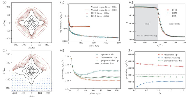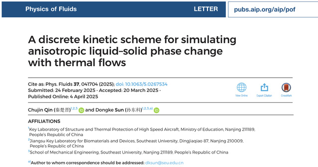 近日,糖心视频 2022级直博生秦楚晋在热对流作用下枝晶生长建模方面取得新进展,相关研究成果以“A discrete kinetic scheme for simulating anisotropic liquid-solid phase change with thermal flows”为题发表在《Physics of Fluids》(流体物理学,PoF)。该期刊是流体力学领域的权威期刊之一,自1958年创刊以来,PoF始终致力于发表流体动力学领域的高质量原创研究,涵盖理论分析、数值模拟和实验探索,是美国物理联合会AIP旗下JCR一区、中科院二区期刊。
