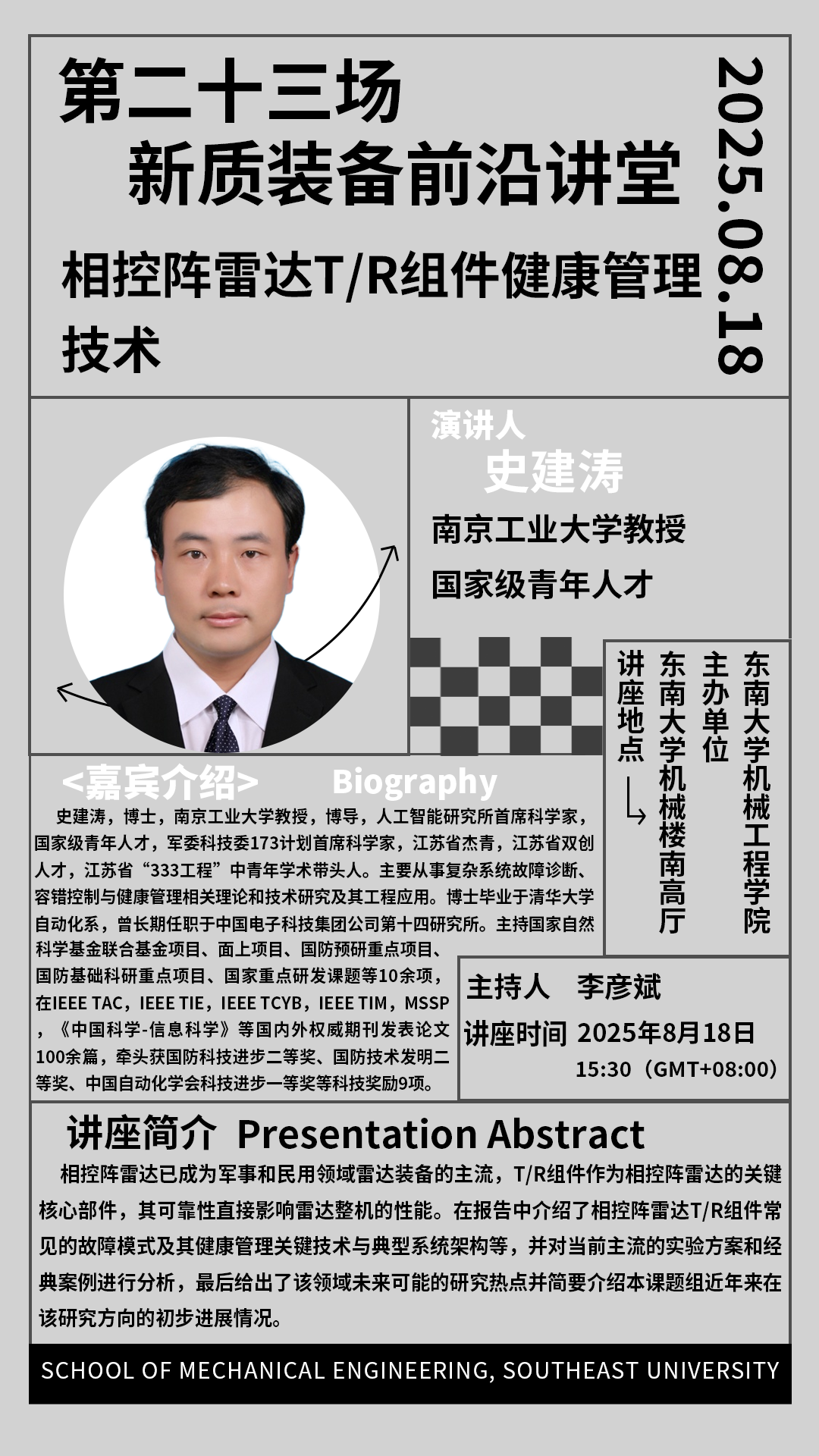 2025年机械学院“新质装备前沿讲堂”第二十三场:史建涛教授——相控阵雷达T/R组件健康管理技术