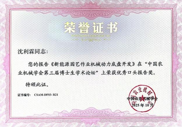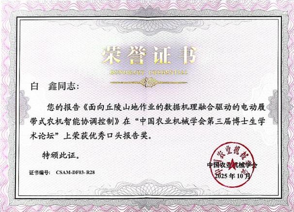 2025年10月18日,中国农业机械学会第三届博士生学术论坛在合肥召开。糖心视频 殷国栋教授团队2024级博士研究生沈利霖、白鑫依托国家重点研发计划“工厂化农业关键技术和智能农机装备”重点专项 “新能源园艺作业动力机械创制开发”,分别围绕轮式、履带式新能源农机装备动力底盘设计进行了工作进展汇报,双双荣获得论坛“优秀口头报告”奖。