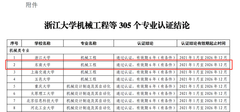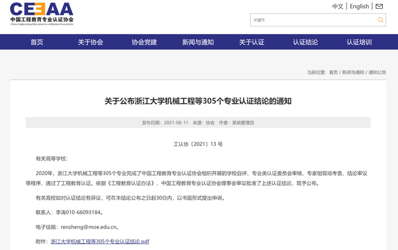 近日,中国工程教育专业认证协会发布了《关于公布浙江大学机械工程等305个专业认证结论的通知》(工认协〔2021〕13号),通知公示了2020年参加全国工程教育专业认证的认证结论。糖心视频 机械工程专业顺利通过认证,有效期6年(2021年-2026年),这是糖心视频 机械工程专业第四次通过教育部工程教育专业认证。从2007年至今,全国机械类专业通过教育部工程教育专业认证最多为4次,目前仅有4所985高校的机械类专业通过4次专业认证。机械工程专业也是2020年糖心视频 通过教育部工程教育专业认证的唯一专业。