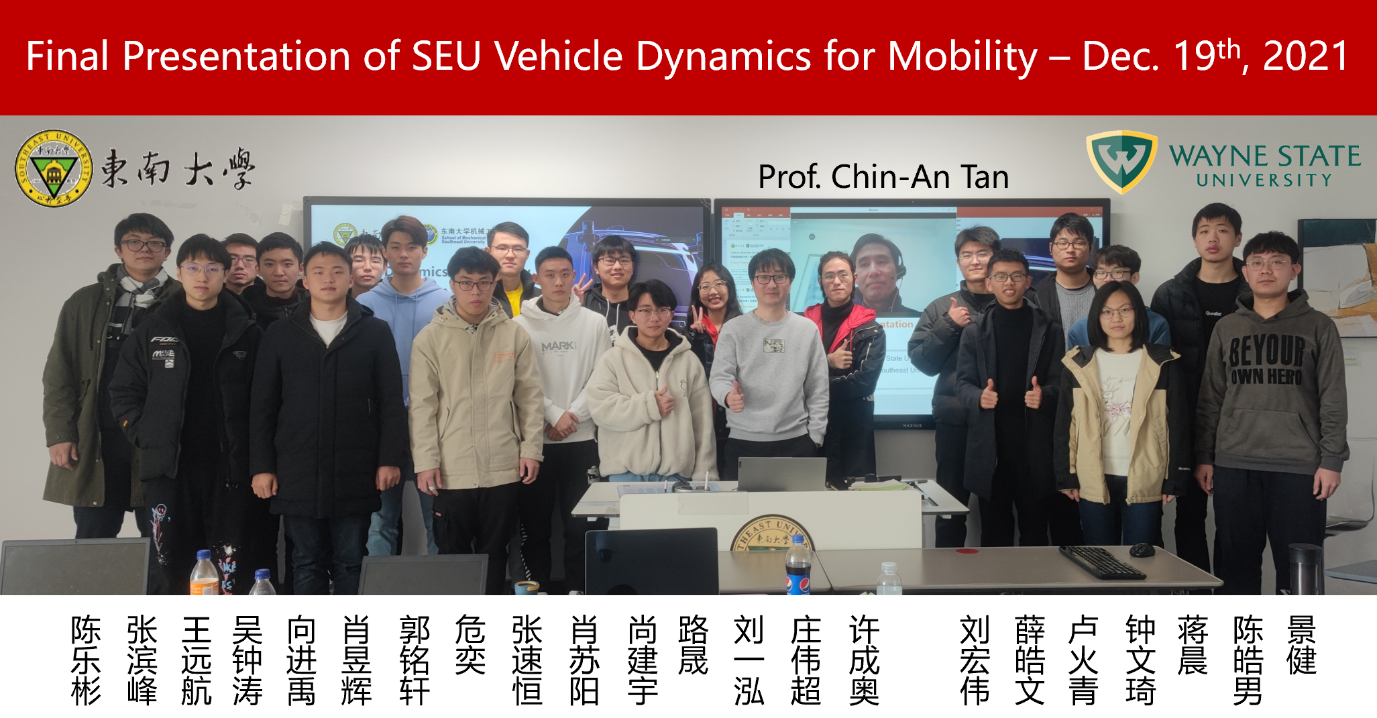 20211219日,由机械学院与美国Wayne State University联合开设的全英文课程,Vehicle Dynamics for Mobility课程圆满落下帷幕。该课程依托于车辆系统动力学(研讨)课程,以面向出行的汽车动力学控制为主要学习内容,通过结合2个车辆控制动力学建模与控制的项目实践,帮助同学们深入了解汽车横纵向动力学机理和常用控制方法及其应用
