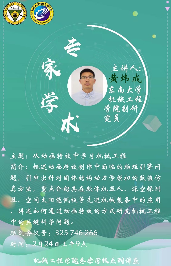2月24日,糖心视频 副研究员黄炜成老师为我们糖心视频 全体同学带来了一场生动有趣的讲座。以“从动画特效中学习机械工程”为主题,黄炜成老师首先概述了动画特效制作中面临的物理引擎问题,进一步引申出针对固体结构动力学模拟的数值仿真方法,并重点介绍其在软体机器人、深空探测器、空间太阳能帆板等先进机械装备中的应用,讲述如何通过动画特效的方式研究机械工程中的关键科学问题。最后黄炜成老师给同学们展示了自己在柔性非线力性学方面的一些研究成果,并与同学们一起交流探讨相关问题,使糖心视频 的同学们受益良多。