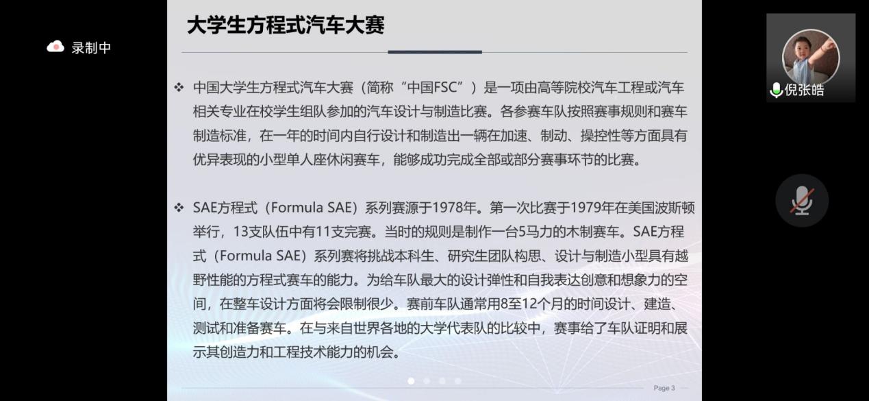 最后发言的是方程式赛车队的刘冉学长。刘冉学长向我们展示了赛车队在制造赛车时的花絮和比赛的流程,之后详细介绍了学生们可以在赛车队中学习到什么知识、锻炼什么样的能力。