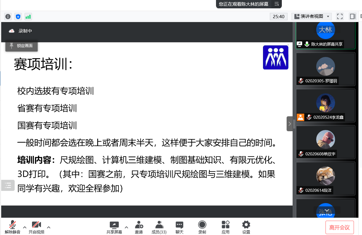 最后,周鹤翔学长进行了竞赛经验的分享,他曾取得了省级一等奖及国家级三等奖的好成绩。学长在鼓励大家积极自信参赛的同时,也强调了比赛的难度和训练的幸苦,在比赛时对软件的熟练程度和绘图速度也会对比赛成绩造成影响。