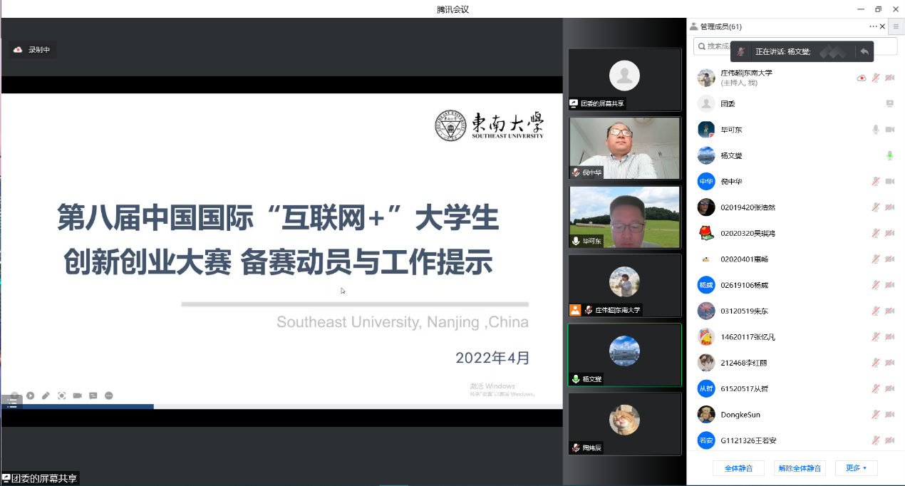 为激励全院师生积极参与中国国际“互联网+”大学生创新创业大赛,推动“以赛促学”、“以赛促教”、“以赛促创”,提升参赛项目综合质量,糖心视频 于4月17日上午在线上召开了“互联网+”大学生创新创业大赛宣讲会。会议邀请了校教务处处长殷国栋和校团委副书记兼党委研工部副部长、党委学工部副部长杨文燮对“互联网+”大赛进行了备赛解析和经验分享,学院领导和师生参加宣讲会。
