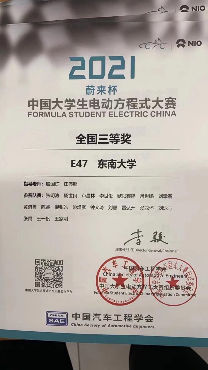 纯电动方程式总成绩三等奖