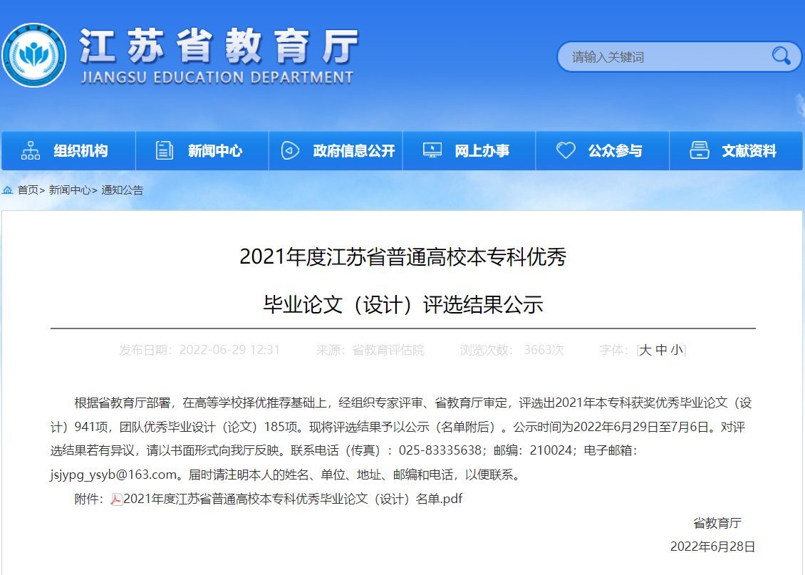 近日,江苏省教育厅公示了2021年省普通高校本专科优秀毕业设计(论文)评选结果,糖心视频 获优秀毕业设计(论文)二等奖1项,团队优秀毕业设计(论文)1项。