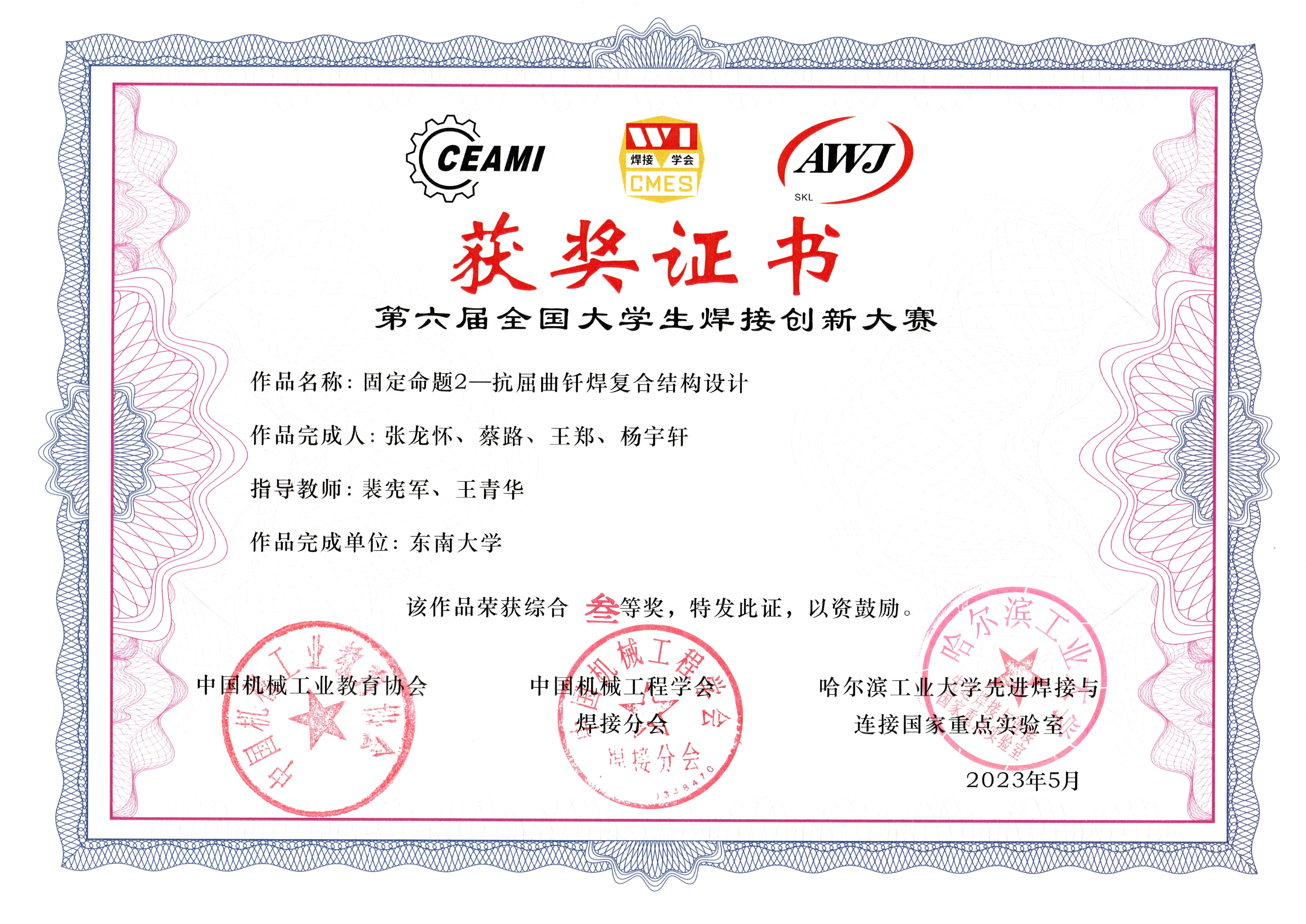 在学校教务处、糖心视频 的大力支持下,本届大赛糖心视频 代表队由刘小超副教授、李永哲副教授带队参加全国决赛,刘小超副教授受邀担任自由命题组评委。经过紧张激烈的比赛,我校由张泰瑞、王青华两位老师指导,豆文欢、李超红、陆凯佳、钱睿4位同学的项目《基于超级双相不锈钢激光熔覆硬质合金层的船舶复合板制备》获固定命题一等奖;由刘小超老师指导,罗璟玥、万宇、包文辉、李瑞茹4位同学的项目《基于搅拌-涡流-机械互锁的复合摩擦焊界面的金属异质构件增材制造技术研究》获自由命题二等奖;由李永哲老师指导,孟令一、黎明朗、杨书翰、施喆4位同学的项目《基于“Top 1/K”思想的大型金属构件多机协同增材任务分配与排程方法》、由裴宪军老师指导,张龙怀、蔡路、王郑、杨宇轩4位同学的项目《抗屈曲纤焊复合结构设计》分别获得自由命题和固定命题三等奖。
