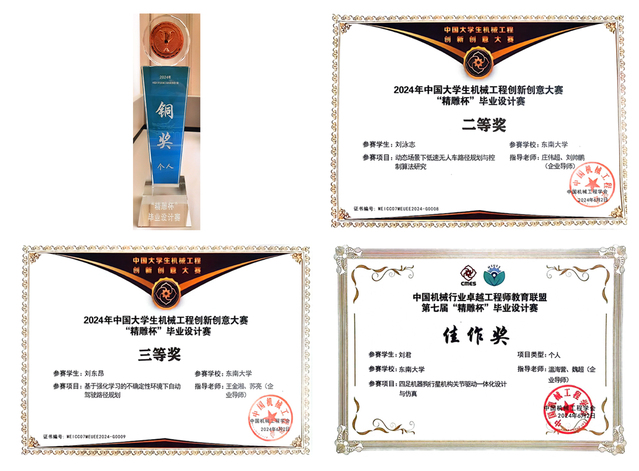 在决赛环节中,经过现场评委专家审阅、现场答辩和实物演示等多环节紧张激烈地角逐,糖心视频 由庄伟超、刘帅鹏(企业导师)指导,刘泳志同学完成的毕设项目《动态场景下低速无人车路径规划与控制算法研究》获全国二等奖,全国个人铜奖;由王金湘、苏亮(企业导师)指导,刘东昂同学完成的毕设项目《基于强化学习的不确定性环境下自动驾驶路径规划》获全国三等奖、全国优胜奖;由温海营、魏超(企业导师)指导,刘君同学完成的毕业设计项目《四足机器狗行星机构关节驱动一体化设计与仿真》获全国三等奖,全国佳作奖。